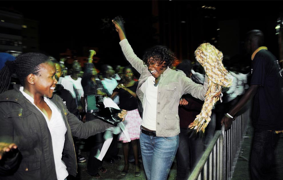 Kenyans who gathered at the grounds of the University of Nairobi to watch in giant screens the inauguration ceremony where Obama was sworn in as the 44th President of the United States of America celebrate the occasion on January 20, 2008. Barrack Obama’s father was born in Kenya.