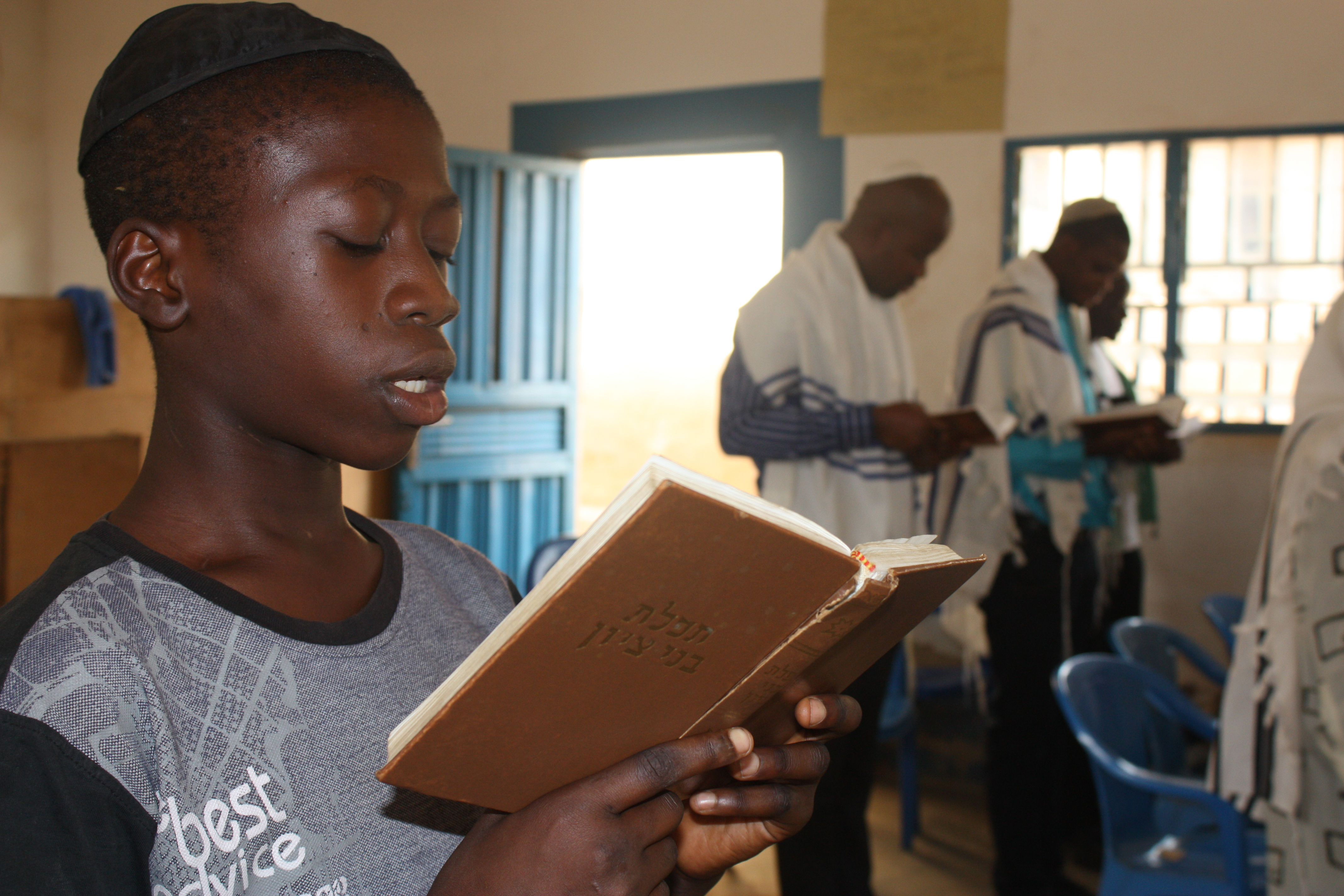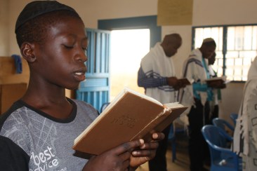 In a synagogue in Nigeria, 14-year-old Kadmiel Izungu Abhor reads from a prayer book during Shabbat service. Photo by Chika Oduah
