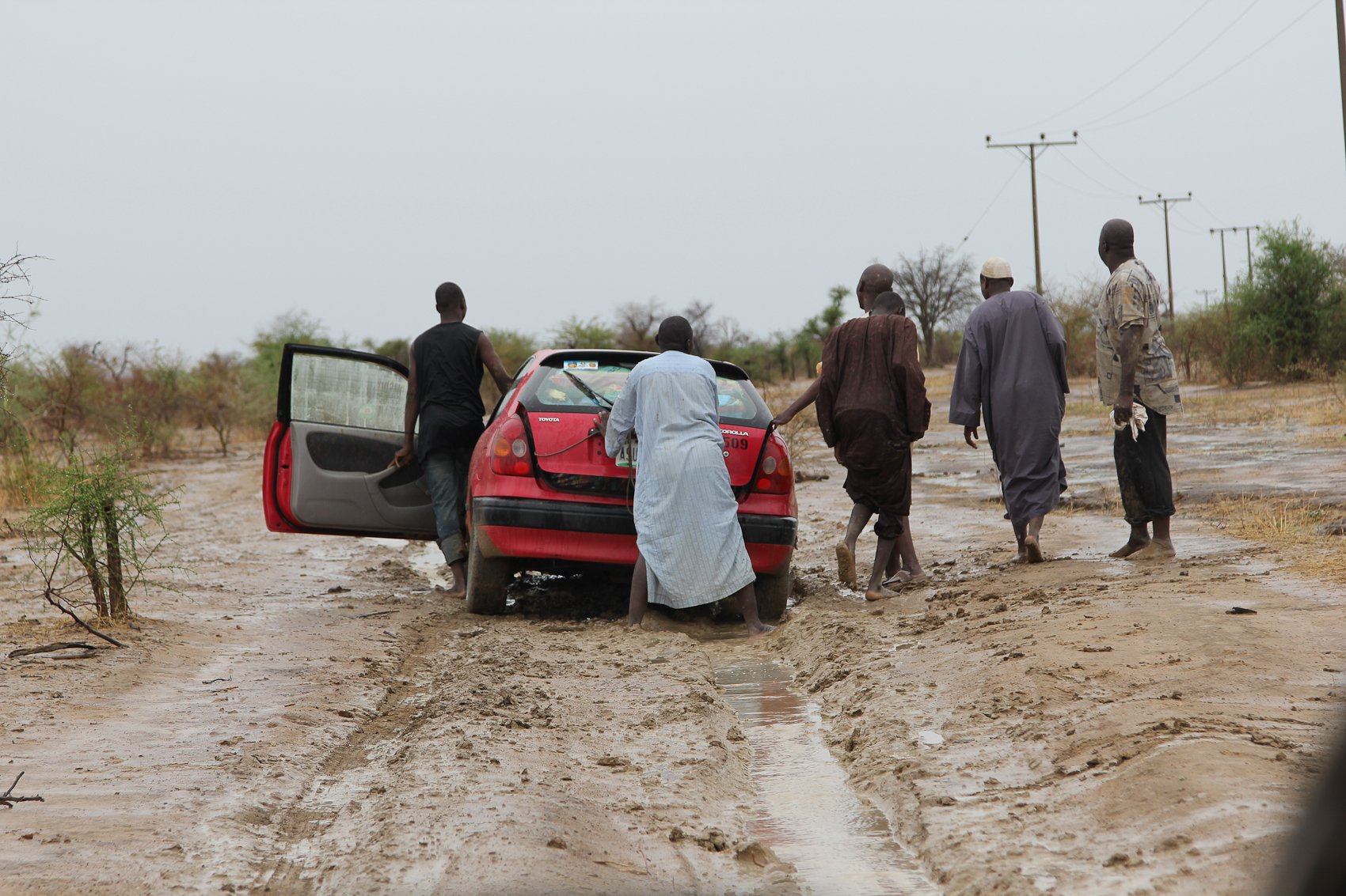 Chibok guys pushing a car out of the mud on a rainy morning.