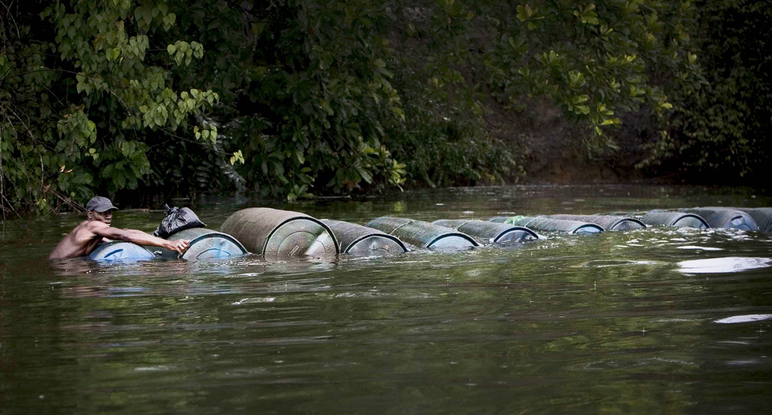 NIGER DELTA, NIGERIA-JULY 2009-A boy is taking away some barils of crude oil to the place wher it will be refined. In Bolo creek, the villagers are bunkering the oil from Shell facilities and refining it to sell it on the black market. Around 30 to 40 illegal refineries can be found all over the creek. The strong presence of the militants is keeping away the army and the police allowing the villagers to work freely. (Photo by Veronique de Viguerie/ Getty Images)