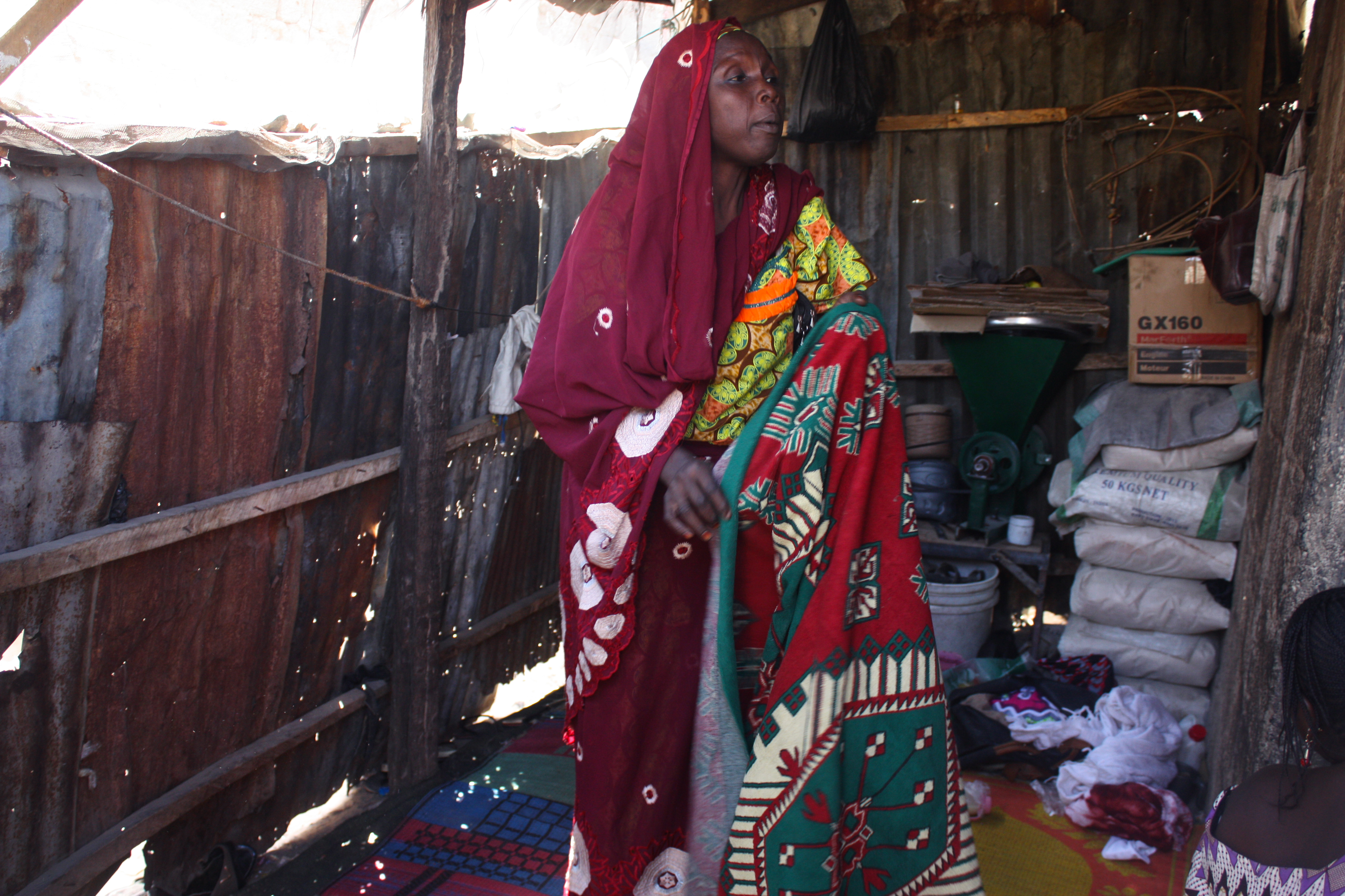 Falmata Gana, widowed after members of the Islamist sect Boko Haram killed her husband in 2012, walks out of the small room she shares with 11 children. Maiduguri, northeastern Nigeria. Photo by Chika Oduah. December 17, 2014
