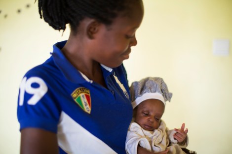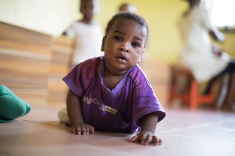 ABUJA — Nine-month-old David drops to his knees, crawls toward a bottle of milk on the counter and begins to whimper. A young lady picks him up and rests him on her hips.